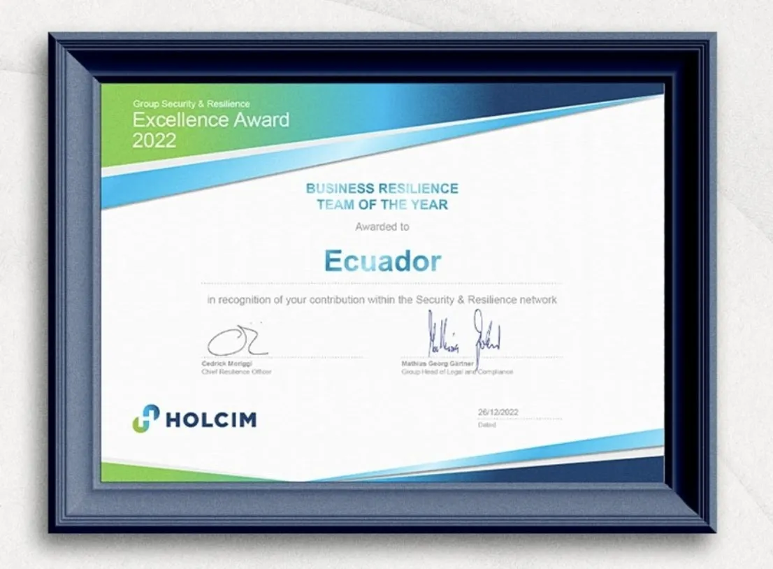 El equipo de Salud y Seguridad de Ecuador fueron otorgados un reconocimiento por parte del grupo Holcim como equipo de resiliencia empresarial del año, en torno a su contribución con la cadena de Seguridad y Resiliencia de la empresa.